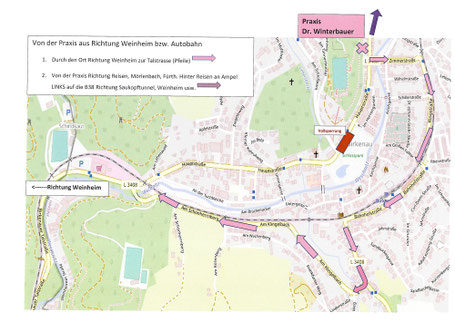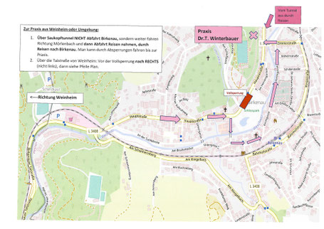 Daher bitten wir Sie die Umleitungen und die veränderte Zufahrt zur Praxis -sowohl von Weinheim, als auch vom Saukopftunnel- zu beachten.